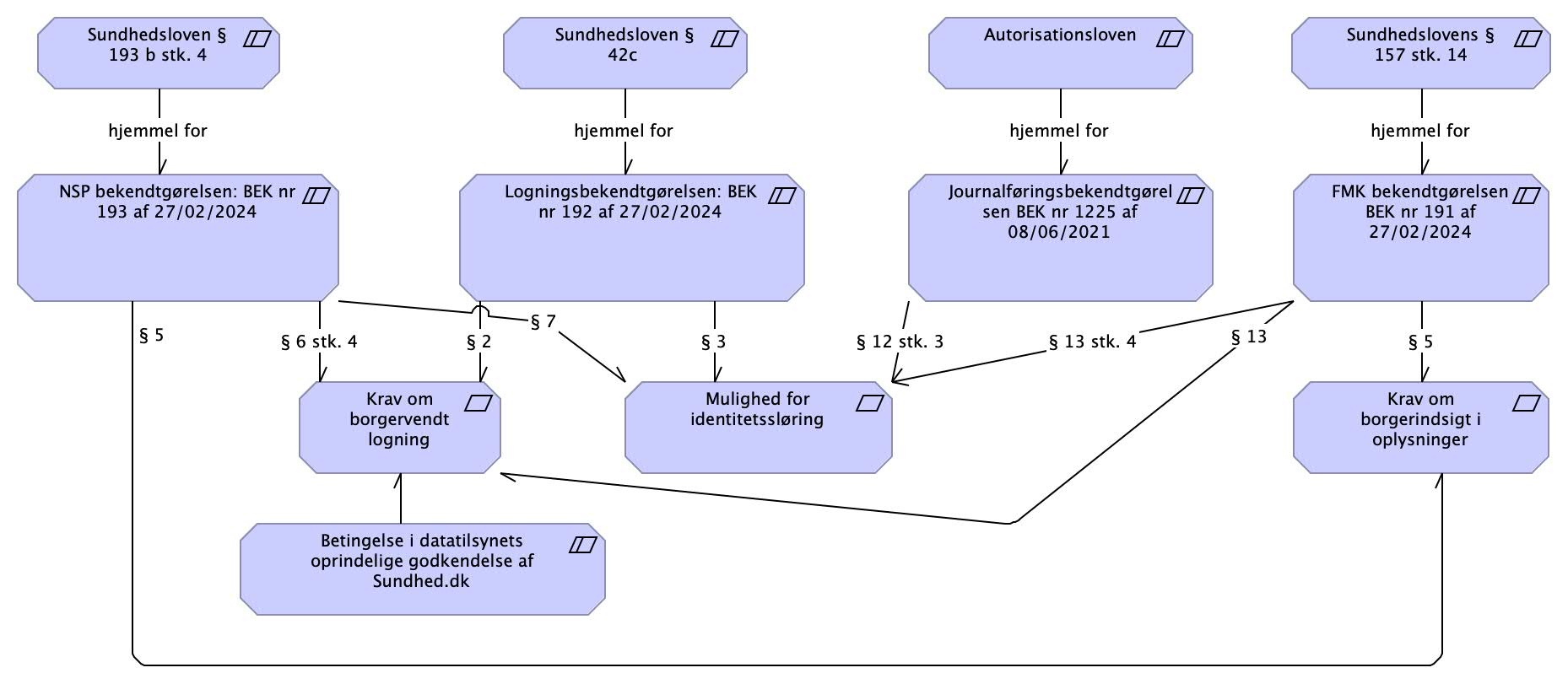 Der er forskellige krav til forskellige løsninger, og dataansvaret ligger ikke hos den samme aktør i de respektive bekendtgørelser. I figuren nedenfor ses et overblik over de relevante love og bekendtgørelser: