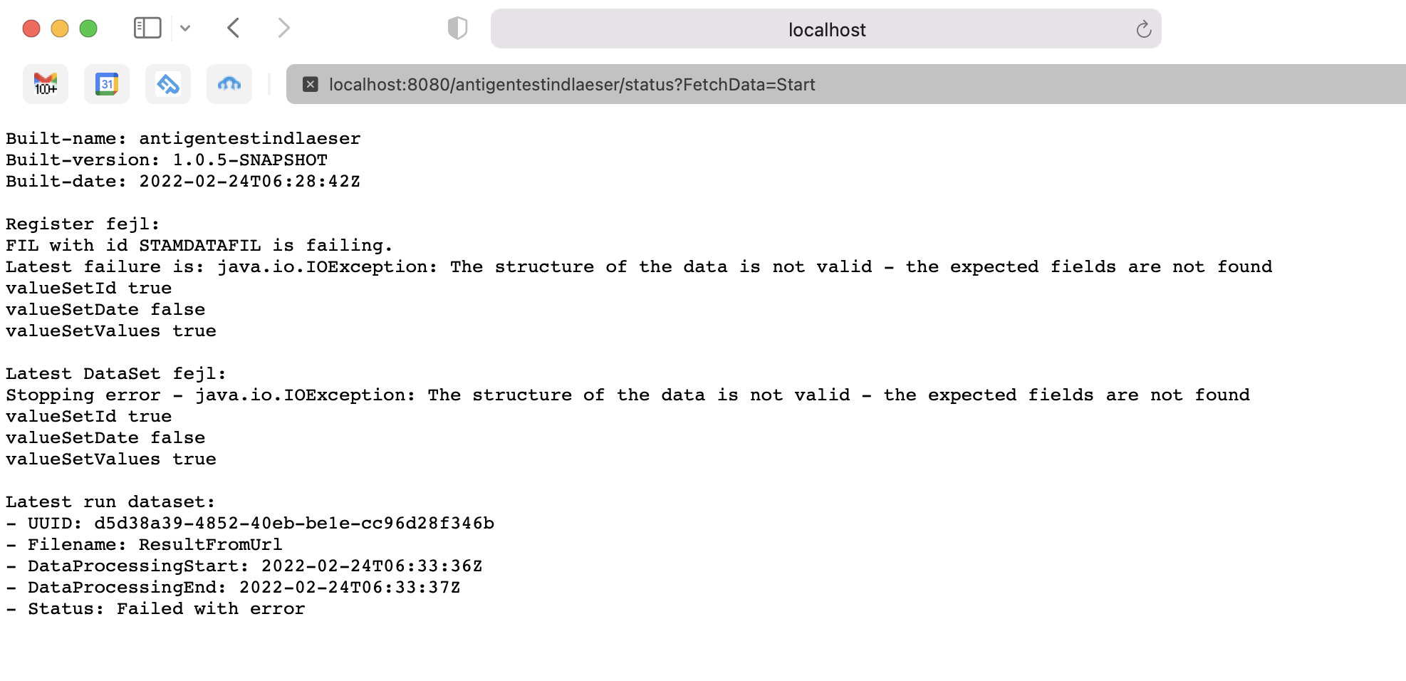 Statusservicen kan tilgås på URL http://<host>:<port>/antigentestindlaeser/status hvor <host> og <port> peger på den aktuelle installation.