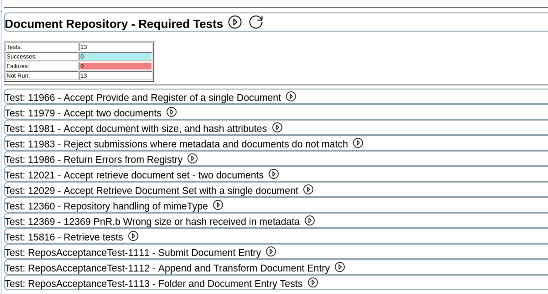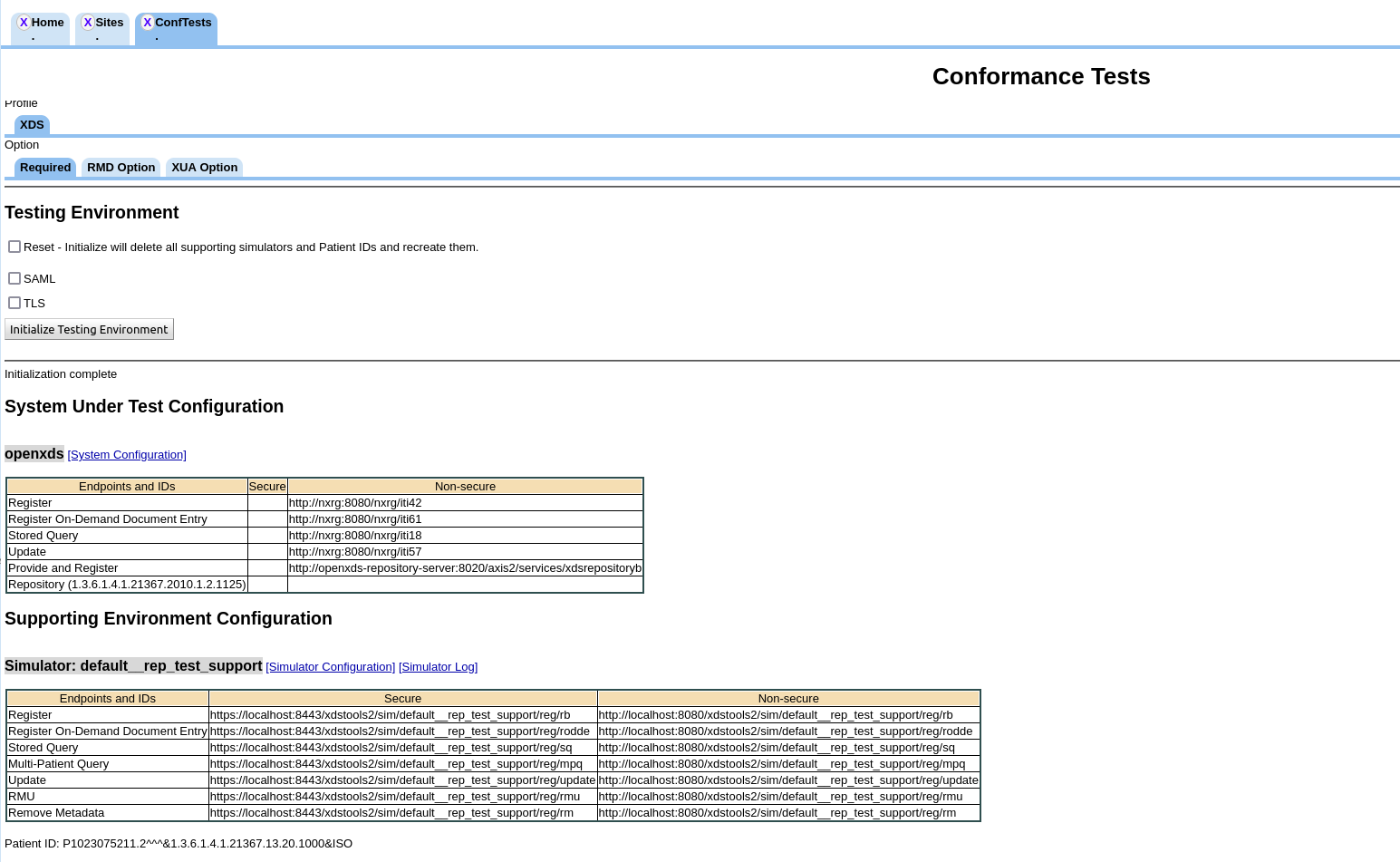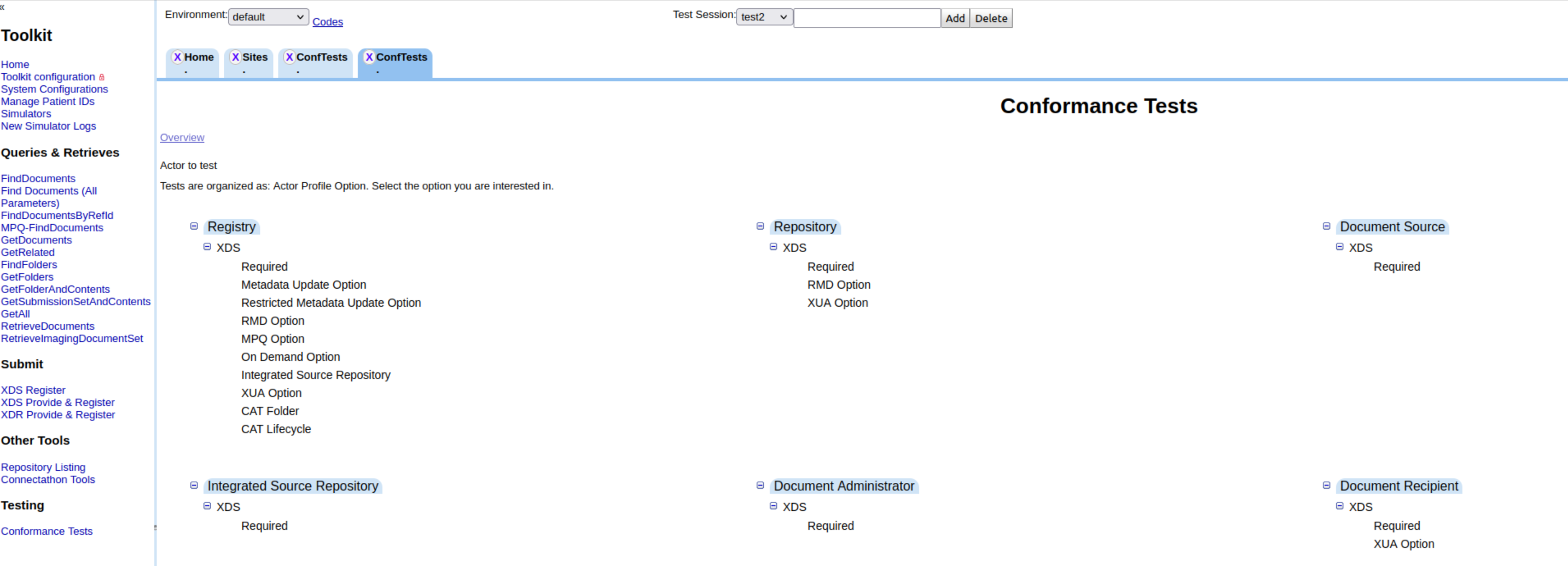 I menuen i XDS Toolkit kan man vælge "Conformance Tests". Herved fåes et overblik over de forskellige IHE XDS aktøerer. I forhold til OpenXds er det relevant at kigge på dem som findes i Repository/XDS/Required