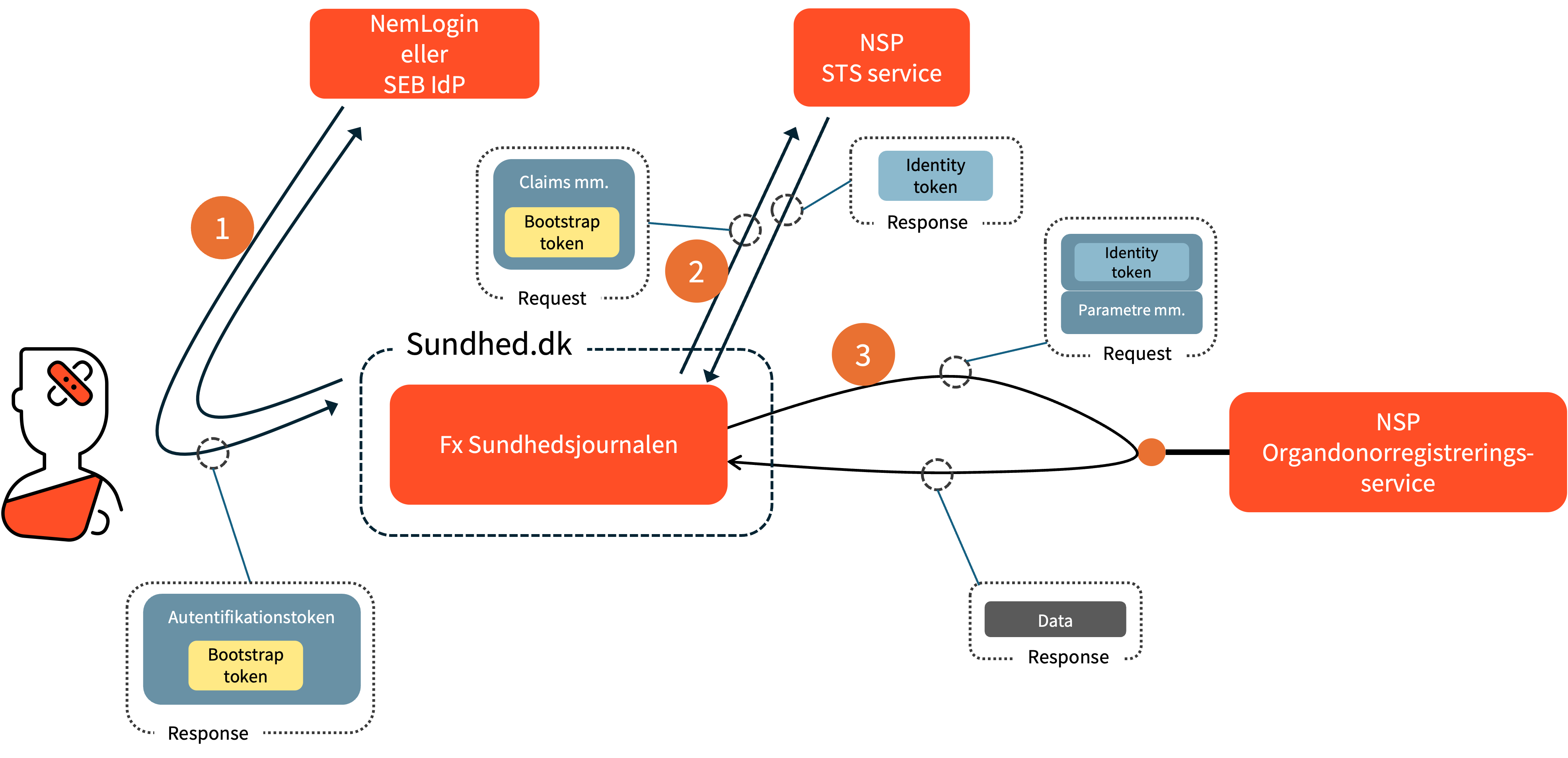 - Borger/Patient: Skal følge Identitetsbaseret Web Service flowet, IDWS