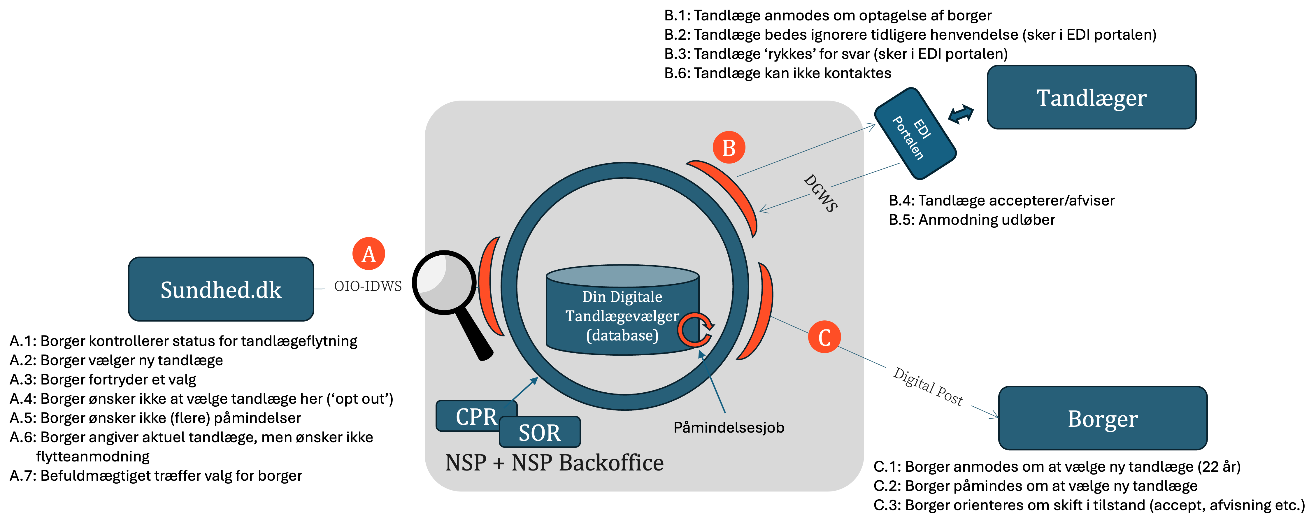 I finansloven 2022 blev det aftalt at forbedre overgangen fra børne- og ungdomstandplejen til voksentandplejen, og generelt at gøre det nemmere for borgere at vælge tandlæge. I den forbindelse skal der etableres en digital løsning, hvor unge i forbindelse med overgang til voksentandplejen bliver gjort opmærksomme på muligheden for at vælge tandlæge via et brev i e-boks og en løsning på Sundhed.dk. Senere vil løsningen blive udvidet til, at alle borgere bliver gjort opmærksom på muligheden for at vælge ny tandlæge i forbindelse med flytning. Den digitale tandlægevælger vil indeholde oplysninger om tandlægernes priser, så borgerne har lettere ved at basere deres valg på basis af en prissammenligning. Dette kan styrke priskonkurrencen mellem tandlægerne til gavn for alle borgere. "Din Digitale Tandlægevælger" har til formål at skabe den digitale løsning, der blev aftalt i 2022 finansloven. Løsningen består af: A. En NSP service til registrering og status af "tandlægeflytninger" (OIO-IDWS service) B. En service til opsamling af svar på flytteanmodninger fra tandlæger (DGWS service) C. En opfordrings- og påmindelsesservice til unge (digital post) inkl. diverse oprydningsservices (Jobs på NSP backend)