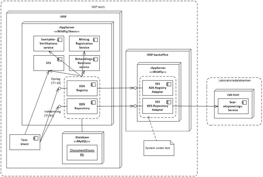 Bemærk, at test-klientens tests fungerer uafhængigt af, hvordan de forskellige services er deployeret, hvorfor en vanlig opsætning af Dokumentdelingsservicen i NSP test1-miljø el. lign. kan anvendes.