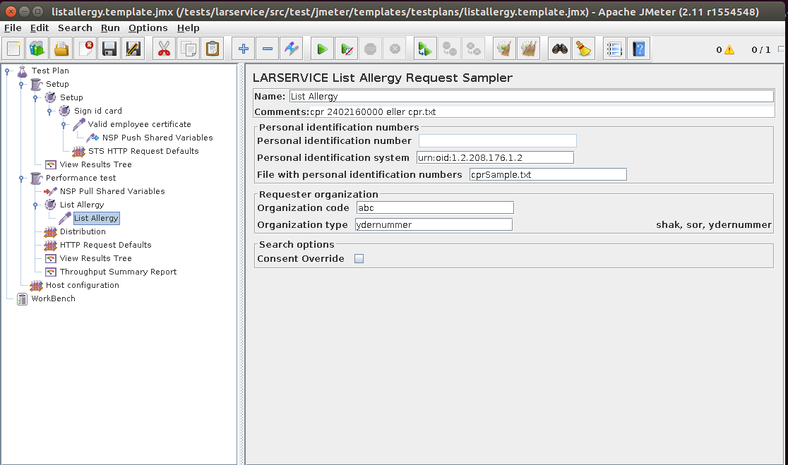 Den endelige kørsel af performance testen skal bruge en test plan (skabes når ovenstående test gemmes) samt en distribution, der indeholder 'Distribution' delen af ovenstående. De gemmes henholdsvis i tests/lar/src/test/jmeter/templates/testplans og tests/lar/src/test/jmeter/templates/distributions