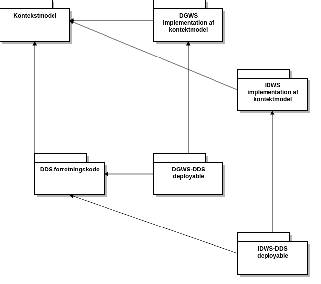 I diagrammet ovenfor er det vist, hvordan DDS forretningskoden kun afhænger af den abstrakte kontekstmodel. De to konkrete implementationer (DGWS og IDWS) anvendes af tynde deployment moduler i DDS, der ikke indeholder forretningskode, men hvis eneste ansvar er at pakketere DDSens forretningskode med den rigtige sikkerhedsimplementation. Diagrammet er forsimplet da DDSens forretningskode i praksis består af mange moduler. Derudover findes der både en DDS Registry og en DDS Repository deployable. Både DDS Repository og DDS Registry leveres i en IDWS og DGWS udgave efter skabelonen ovenfor.