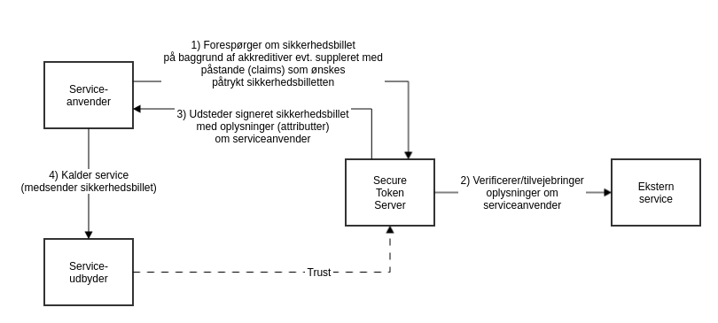 Ideen med en Secure Token Server er, at der kan opnåes en afkobling mellem serviceanvender og serviceudbyder som illustreret i figuren nedenfor.