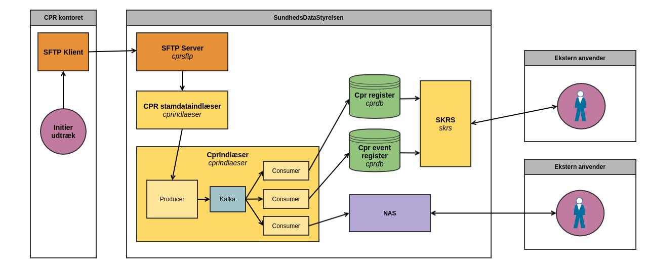 Illutration af hvilke komponenter og servere der benyttes i forbindelse med indlæsning af Cpr-data: