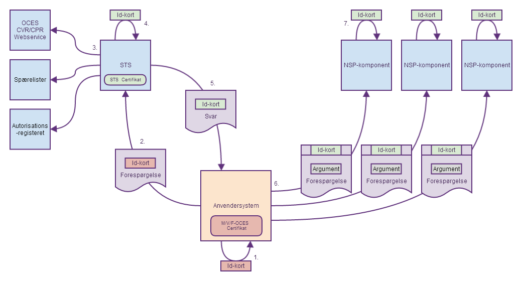 IdentitetsserviceAdgang til NSP-komponenters services er begrænset med autentificering. Denne autentifikation er baseret på OCES-certifikater, hvormed anvendere er i stand til at identificere sig. Det betyder dog ikke at alle services skal validere alle anvenderes certifikater og tilhørende information. Dette vil være et stort ansvar at fordele på så mange komponenter. Derfor er der en fælles komponent, som kan udstede adgangsgivende billetter, som kun kræver simpel verifikation. En sådan komponent betegnes generelt som en "Identitetsservice" eller IdP (IdentityProvider). På NSP hedder servicen Security Token Service (STS). Introduktionen af STS betyder at en anvender udelukkende skal identificere sig overfor STS med sit OCES-certifikat og får herefter et id-kort, der er underskrevet med (STS) føderationens certifikat. Dette id-kort agerer som nøglen der identificerer anvenderen, og kan give adgang til de andre komponenter på NSP. Komponenternes ansvar er derfor kun kende til STS'ens ene certifikat og verificere dette i id-kortet. STS verificere og beriger desuden id-kortet med en række af attributter. F.eks. verificeres slutbrugerens personnummer og dennes autorisation. Føderation, ombytning af id-kort og servicekaldFølgende er et eksempel på hvad der sker i de forskellige skridt når en anvender ombytter sit id-kort til et signeret af STS: