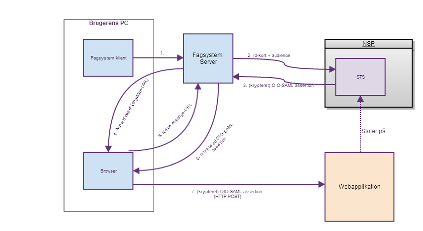 Brugeren videredirigeres til IdP'en i form at et autentifikationsrequest. IdP'en efterspørger om nødvendigt credentials fra brugeren (i form af digitalt certifikat eller papkort) og dirigerer herefter brugeren tilbage til webapplikationen med et krypteret token.