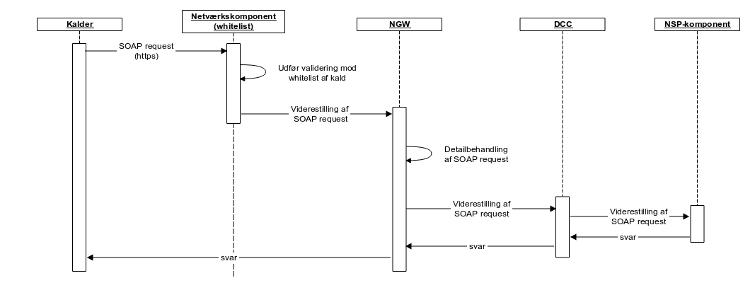 Dette er uddybet i afsnit 3.2. AnvendelseNGW har en række karaktertræk til fælles med SOSI-GW, hvad angår virkemåde og kaldsemantik. Der eksisterer dog også undtagelser, som er beskrevet i nærmere detalje i følgende afsnit. AdgangDet er et krav at anvendere benytter TLS ved forbindelse til NGW. I praksis vil det være med benyttelse af HTTPS, i alle kald, under anvendelse af et FOCES klient-certifikat, som tilhører anvenders organisation. Dette certifikat valideres mod en whitelist i en netværkskomponent, der topologisk er placeret udenfor og før NGW. Kun certifikater der godkendes her vil få adgang til NGW. Et succesfuldt kald til en NSP-komponent gennem NGW over DCC ser overordnet således ud: Ved "detailbehandling af SOAP request" skal forstås bl.a. det arbejde NGW gør for at håndtere ID-kort ifht. den partitionering som er konfigureret, der sikrer isolation mellem ID-kort instanser. Ved fund af følgende uregelmæssigheder ifbm. validering af kaldet returneres en passende reaktion fra Netværkskomponenten: