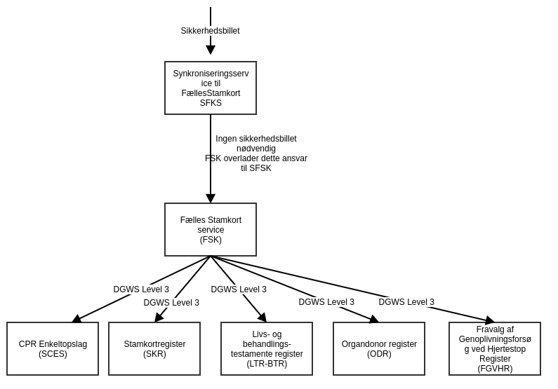 Kald til FSK servicen foretages alene igennem Synkroniseringsservice til Fællesstamkort (SFSK). Da FSK ikke kaldes direkte af anvenderne, overlader FSK sikkerhedstjek og forretningsregler vedr. adgang til disse services. FSK kan derfor kaldes uden sikkerhedsbillet. Af bagudkompatibilitetshensyn tillader FSK at sikkerhedsbillet medsendes, men vil ignorere denne.