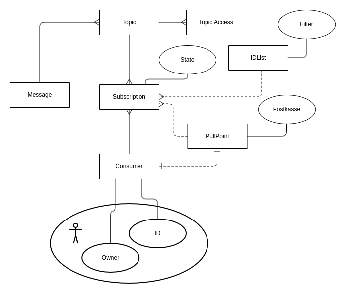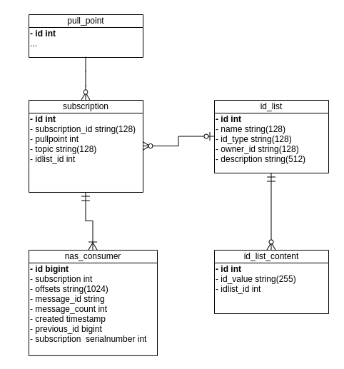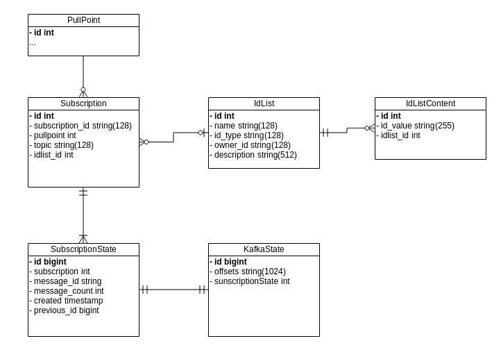 Offset håndteringNår en klient henter beskeder/notifikationer på et pullpoint, skal der fortsættes fra der hvor klienten sidst slap. Denne information gemmes i Beskeder vil blive uniform fordelt til partitioner tilhørende et topic. Når beskeder skal hentes ud igen, skal en Kafka consumer, altså Pullpoint servicen, sættes op sådan, at den henter fra samtlige partitioner for et givet topic. Der skal hentes ud fra det offset, der er gemt for den pågældende subscription og partition. Når tilstrækkelige beskeder er hentet og der skal returneres til klient, gemmes nye offsets til den efterspurgte subscription i databasen igen. Måden offsets gemmes på er i en "liste" i offset i AbonnementerFor at data kan leveres til et pull point skal der være et eller flere abonnementer (Subscription). En subscription relaterer sig til et PullPoint og en række offsets (NasConsumer) og en evt. id list (IdList). NasConsumer er en representation af hvor langt en consumer er nået samt identifikation af seneste kald. Identifikation af seneste kald er nødvendig for at overholde DGWS krav omkring at gensende seneste svar. Hvor langt en consumer er nået er blot en tekststreng og så er det op til Kafka at fortolke denne tekststreng. Dette er med til at sikre en afkopling mellem det underliggende system til at gemme beskeder og forretningslogikken. NasConsumer er modelleret så der udelukkende læses og indsættes rækker i tabellen. Når seneste offset skal hentes, så er det blot nødvendigt at læse nyeste række for den subscription, der er tale om. Der er ikke brug for at opdatere eksisterende rækker. Dette betyder også, at det løbende skal ryddes op, så gamle rækker fjernes. Dette håndeteres i Cleanup Service. IdList og tilhørende IdListContent er en representation af det eventuelle filter der er på en subscription. Det vil sige at det er en filtrering af beskeder til en given subscription.