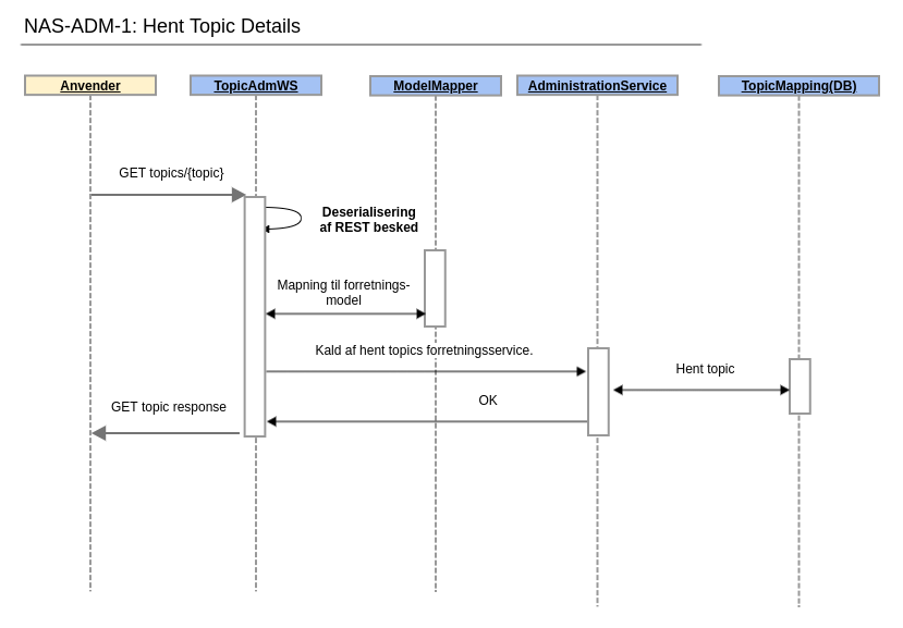 Administration ServiceAdministration service har som ansvarsområde at udstille et REST endpoint til anvendelse af driften. ![]() Dette endpoint kan anvendes til oprette topics, nedlægge topics osv. i NAS. Servicen er som de andre services i NAS2 lagdelt. Den adskiller sig dog fra de andre services ved at den ikke udstiller et SOAP WebService med DGWS. Derimod udstiller den et REST endpoint. Dette endpoint har ikke noget sikkerhedslag da det kun er udstillet til driften. User storiesI forhold til Administration Service er følgende user stories relevante: