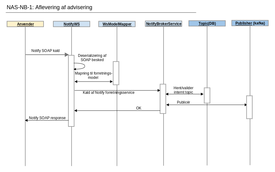 NotificationBroker er inddelt i lag. Selve oprettelse og orkestrering af NotificationBrokers komponenter varetages af en konfigurationskomponent. Denne konfigurationskomponent er også ansvarlig for at inkludere de relevante konfigurationer fra de delte komponenter, som NotificationBroker anvender: Det drejer sig om Topic-delen af databasekomponenten samt Publisher-delen af kafkakomponenten. På ydersiden af NotificationBroker findes Service Interface: Dette lag er ansvarlig for at udbyde Notify SOAP servicen samt at foretage mapning ned i mod den model, der anvendes i forretningslaget i NotificationBroker. Forretningslaget indeholder forretningslogikken: Dvs tjek på, om det indkommende topic er et lovligt NAS topic og publisering til den underliggende infrastruktur. User storiesI forhold til NotificationBroker er følgende user stories relevante: