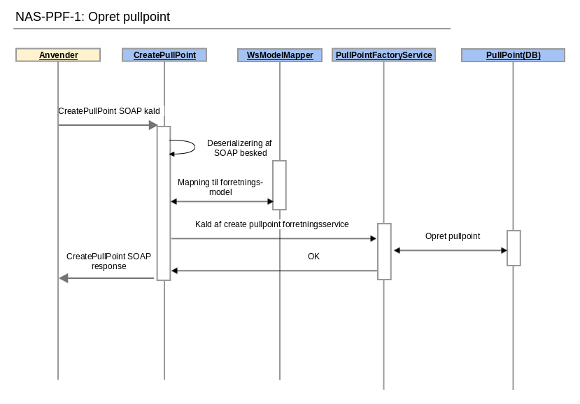 Pullpoint Factory ServicePullPointFactory har som ansvarsområde at udstille et endpoint, som anvendere kan bruge til at oprette pullpoints. ![]() Servicen er ligesom alle øvrige services inddelt i lag og opbygningen er identisk med PullPoint – se afsnit herom. Den eneste forskel er at PullPointFactory ikke anvender Kafka og dermed ikke har noget med Streamer interfacet at gøre. User storiesI forhold til Pullpoint Factory Service er følgende user stories relevante: