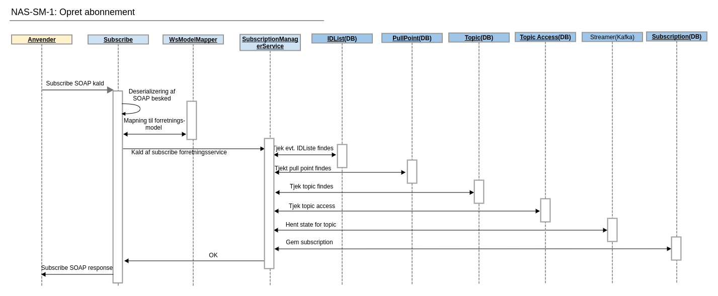 Subscription managerSubscription Manager Servicen har som ansvarsområde at udstille et endpoint, som anvendere kan bruge til at oprette og nedlægge subscriptions. ![]() En subscription er et abbonnement på et topic hvor der kan være tilknyttet en id liste. Abonnementet er det der knytter et pull point og et topic sammen. Subscription manager servicen udstiller to SOAP actions. En operation der hedder Subscribe og en der hedder Unsubscribe. Subscribe anvendes til at oprette subscriptions. Unsubscribe anvendes til at nedlægge subscriptions. Subscription Manager Servicen er inddelt i lag. Selve oprettelse og orkestrering af Subscription Manager Service komponenter varetages af en konfigurationskomponent. Denne konfigurationskomponent er også ansvarlig for at inkludere de relevante konfigurationer fra de delte komponenter, som Subscription Manager anvender: Det drejer sig om alle dele af database komponenten samt streamer delen af Kafka komponenten. På ydersiden af Subscription Manager findes Service Interface: Dette lag er ansvarlig for at udbyde Subscribe samt Unsubscribe SOAP servicene samt at foretage mapning ned i mod den model, der anvendes i forretningslaget i SubscriptionManagerService. Forretningslaget indeholder forretningslogikken: Subscription Manager Service enten opretter eller nedlægger en subscription. En subscription persisteres i databasen ved hjælp af kald til metoder i databaselaget. User storiesI forhold til Subscription Manager Service er følgende user stories relevante: