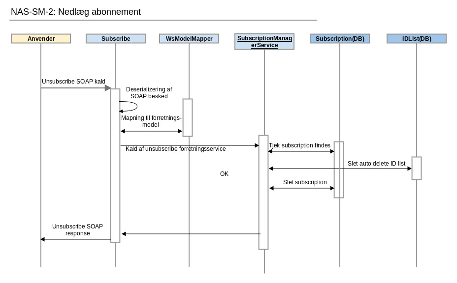 SekvensdiagramNedenstående 2 sekvensdiagrammer viser hvordan man henholdsvis opretter ned nedlægger subscriptions. Hvert af de 2 sekvensdiagrammer er knyttet til en user story ved samme navn.