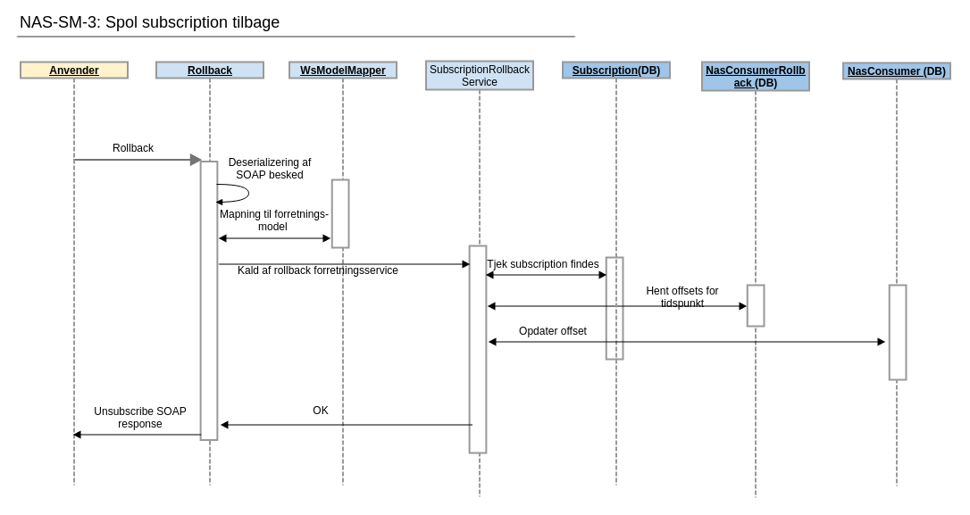 Nas Consumer RollbackFor alle topics gemmes offsets med mellemrum. Dette gøres for at understøtte muligheden for at spole en given subscription tilbage til et givent tidspunkt. Offsets gemmes i tabellen nas_consumer_rollback.
