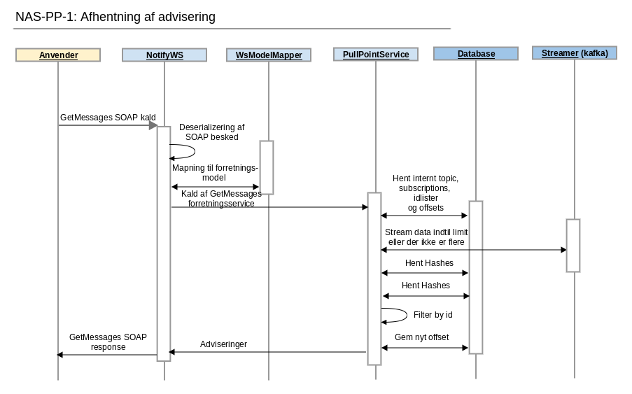 PullPoint ServicePullPoint Service har som ansvarsområde at udstille et endpoint, som anvendere kan bruge til at hente adviseringer fra NAS2 for et givent pullpoint. ![]() Som en del af dette, er det op til PullPoint Service at opretholde en status for hvert abonnement under et givent pull point, der fortæller, hvor langt anvenderen er kommet i afhentningen. PullPoint Service er inddelt i lag. Selve oprettelse og orkestrering af PullPoint Service komponenter varetages af en konfigurationskomponent. Denne konfigurationskomponent er også ansvarlig for at inkludere de relevante konfigurationer fra de delte komponenter, som PullPoint anvender: Det drejer sig om PullPoint-delen af databasekomponenten samt Streamer-delen af kafkakomponenten. På ydersiden af PullPoint findes Service Interface: Dette lag er ansvarlig for at udbyde GetMessages SOAP servicen samt at foretage mapning ned i mod den model, der anvendes i forretningslaget i PullPointService. Forretningslaget indeholder forretningslogikken: PullPoint Service henter notifikationer fra Kafka via Streamer interfacet, som stilles til rådighed via det fælles Kafka modul. Til at holde styr på tilstanden for hvert abonnement anvender PullPoint Service det fælles database modul, der holder styr på tilstand (offset) hvor hvert abonnement. User storiesI forhold til PullPoint Service er følgende user stories relevante: