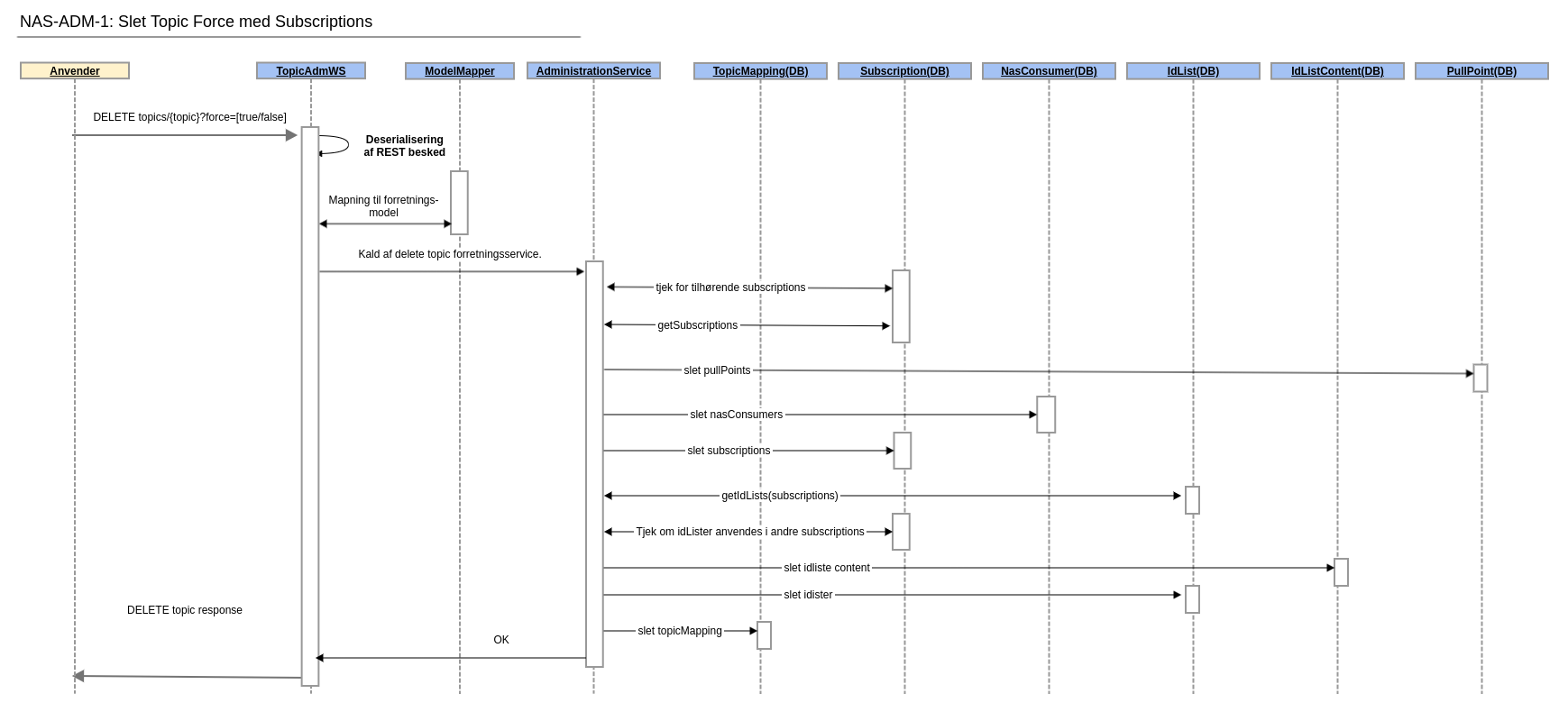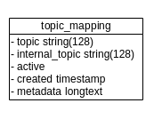 * Hver kasse i ovenstående diagram har en kort forklaring, som kommer frem i et nyt browservindue, når der klikkes på kassen. Til den følgende model, er der taget udgangspunkt i databasemodellen fra NAS 1.x. Umiddelbart er der dog ingen grund til at have flere database schema, så som der tidligere har eksisteret. Topic mapningDer skal være muligt at mappe topics indeholdt i notifikationer til Kafka topics. Denne 1-til-1 mapning er givet ved følgende tabel:
