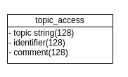 Eventuelle metadata-informationer såsom f.eks. hvem der har oprettet topic kan tilføjes metadata kolonnen. Metadata kolonnen vil blive gemt som JSON og dermed kan den udvides med ekstra værdier efter behov. Disse felter vil som udgangspunkt ikke blive læse i servicen og dermed er servicen heller ikke afhængig af hvad der står i metadata kolonnen. Topic AccessFor at oprette et abonnement på et Topic eller hente beskeder/notifikationer for et Topic, skal klienten have adgang til det specifikke Topic. Adgangen til Topics gives i følgende tabel: