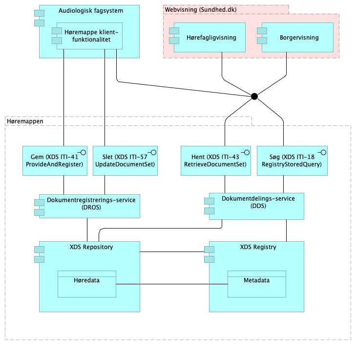 Nedenstående figur illustrerer anvendelsen af Høremappens snitflader fra henholdvis et audiologisk fagsystem og en webvisning.