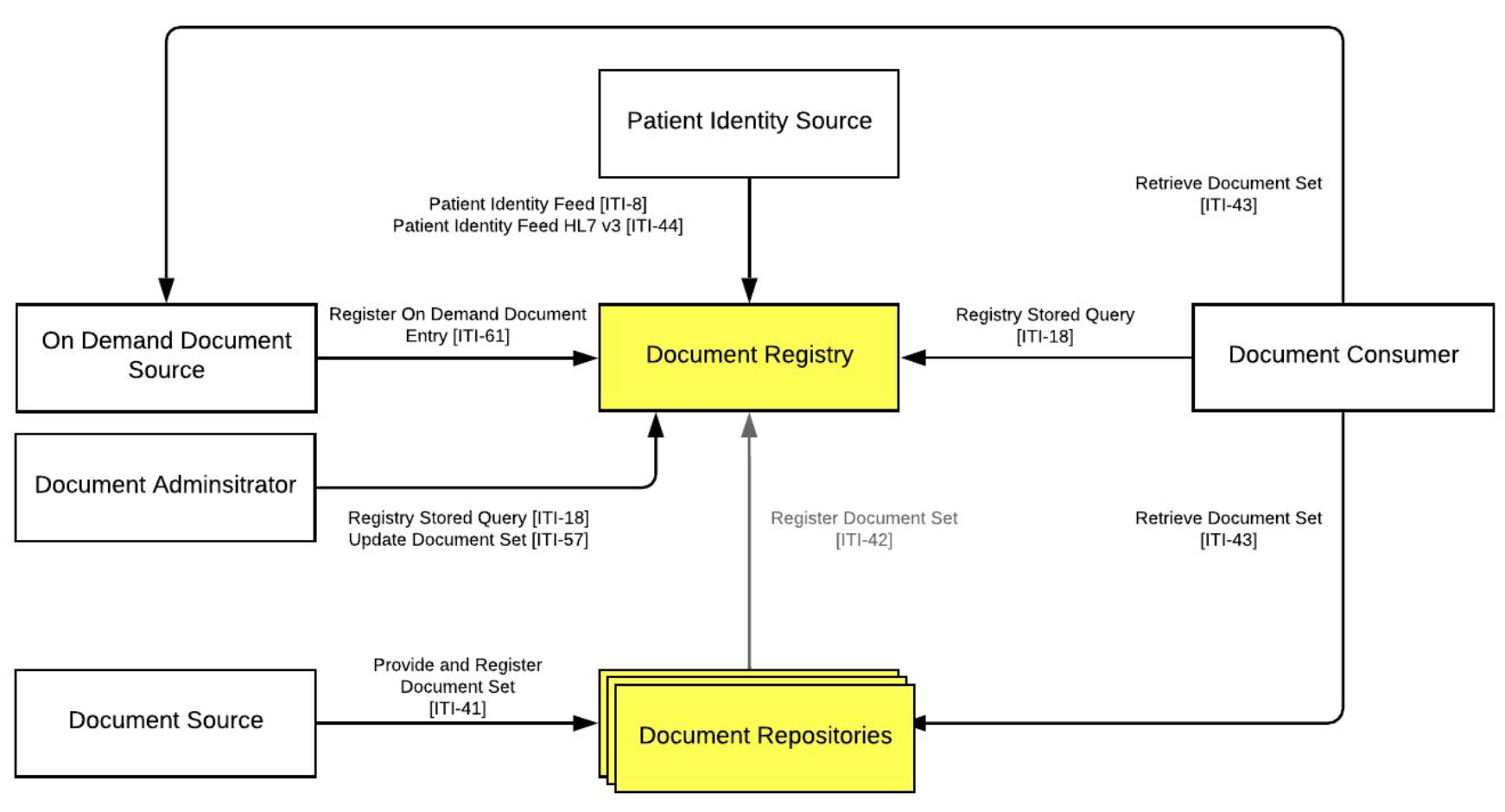 Som vist i figuren  defineres i IHE-XDS en række faste roller og operationer (kaldet transaktioner og navngivet som ITI-xx ), eksempelvis benytter en dokumentaftager (en Document Consumer ) ITI-18 transaktionen til at søge i et Registry og ITI-43 transaktionen til efterfølgende at hente fremsøgte dokumenter fra det pågældende Repository .