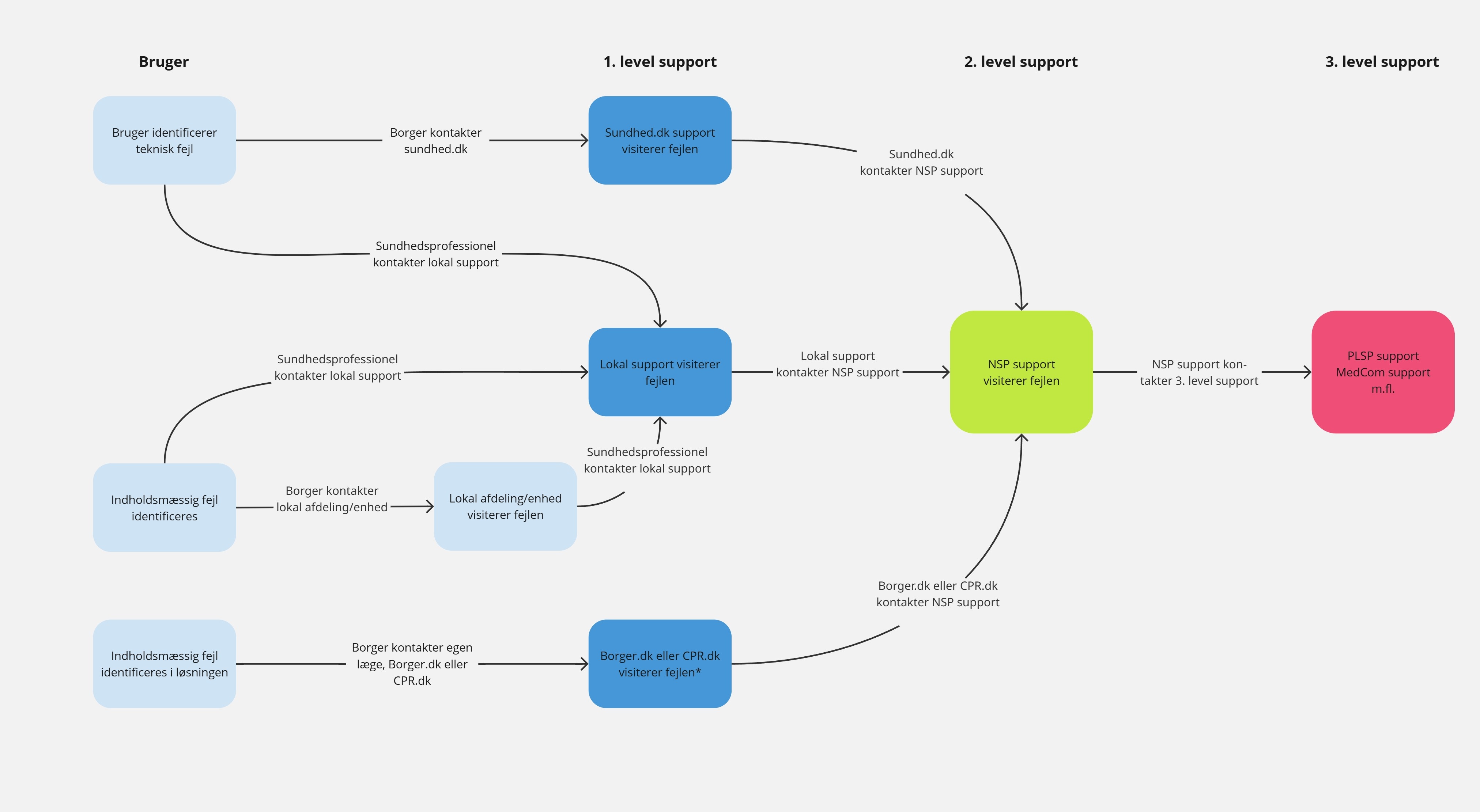 Nedenstående figur viser et overblik over supportflowet. Under figuren er flowet beskrevet med supplerende oplysninger for flowet, 1) når en sundhedsprofessionel opdager fejlen, og 2) når en borger opdager fejlen.