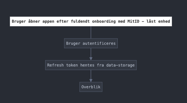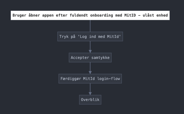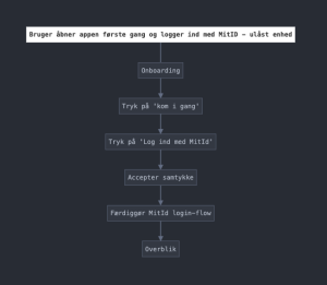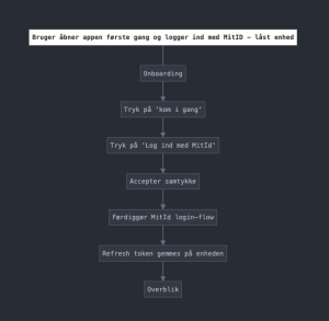 Skærme og logik for flows omhandlede onboarding, login med MitID og enhedsautentificering. Nedenstående diagrammer dokumenter de forskellige variatoner af flowet for at logge ind med MitID og registrere sig i appen:
