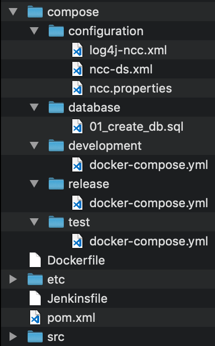 For hver komponent skal der være en compose folder under roden af repository'et. Folderen skal indeholde en docker-compose fil, der udtaler sig om hvordan komponenten startes i testsammenhæng og een der udtaler sig om hvordan komponenten startes, når denne skal deployes i NSP miljøerne. Yderligere kan man som leverandør have stor fordel af at lave en development compose-fil, som kan anvendes i udviklingsammenhæng (med mulighed for at mappe stier til deployment af war-filer og specificere hvor dockerfiler findes til build øjemed).