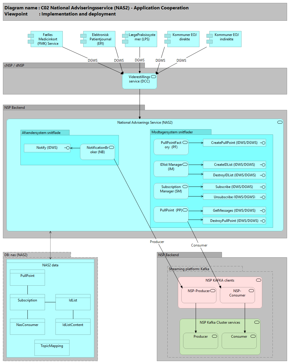 - DB: Topic-delen af databasekomponenten (TopicMapping anvendes til at validere det indkommende NAS topic og mapning ned til internt (kafka) topic)