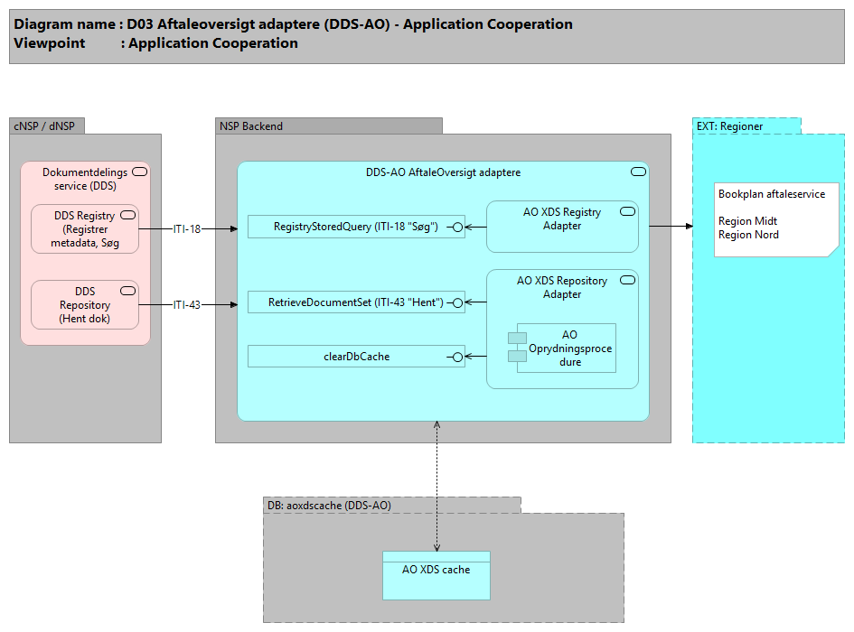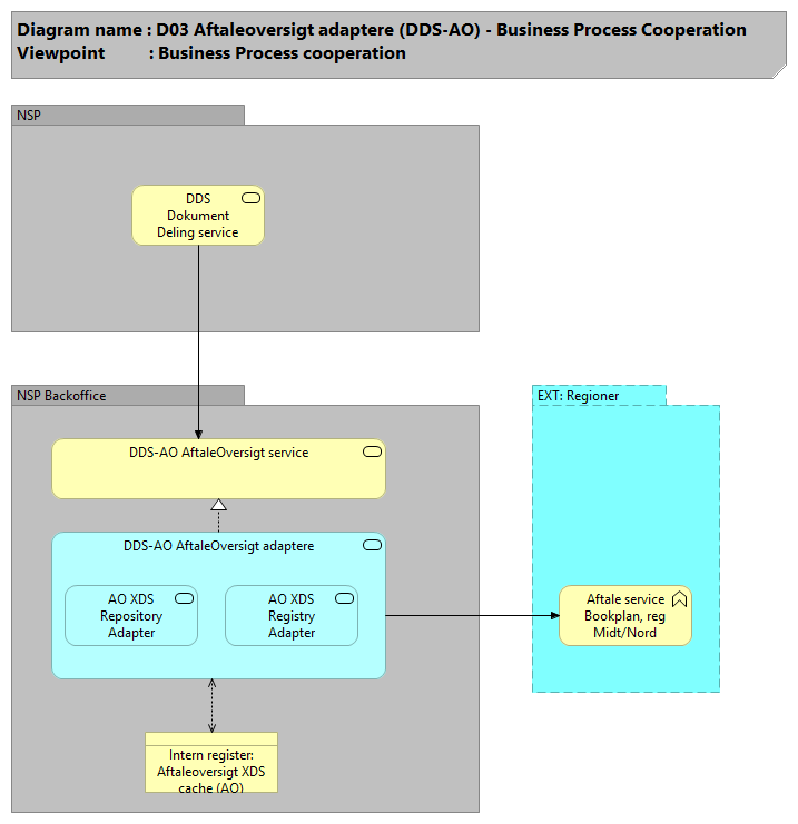 Dokumentdata hentes i Bookplan. ( Region Midt og Region Nord)DDS indhenter dokumentmetadata og aftaleoversigtsdokumenter ved at kalde Aftaleoversigt XDS Registry Adapter og Aftaleoversigt XDS Repository Adapter, samlet kendt som Aftaleoversigt XDS-adaptere. Indholdet i aftaleoversigtsdokumenter skaber Aftaleoversigt XDS Repository Adapter ved at kalde Bookplans REST-ful aftaleservice.
