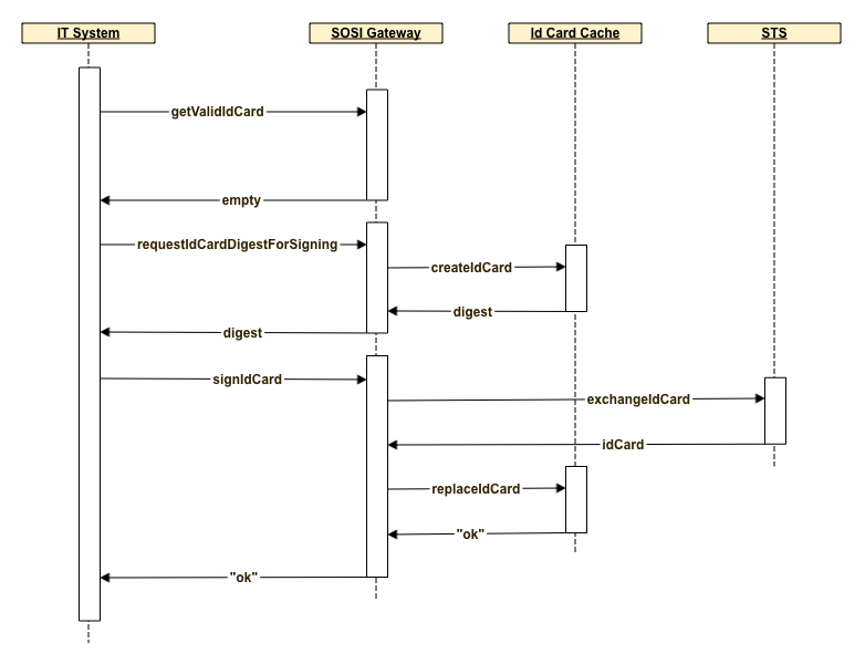 Hvis der ikke ligger et aktivt id-kort i cachen bygges der et nyt usigneret id-kort efter reglerne beskrevet i guiden STS - Signering, og dette sendes til SOSI Gateway via operationen "requestIdCardDigestForSigning". Slutbrugerens certifikat og privat nøgle fremfindes og anvendes til at underskrive det digest der blev returneret fra SOSI Gateway. Signaturen sendes nu med operationen "signIdCard". Efter disse operationer er gennemført ligger der et aktivt id-kort signeret af STS'en i SOSI Gateway cachen.