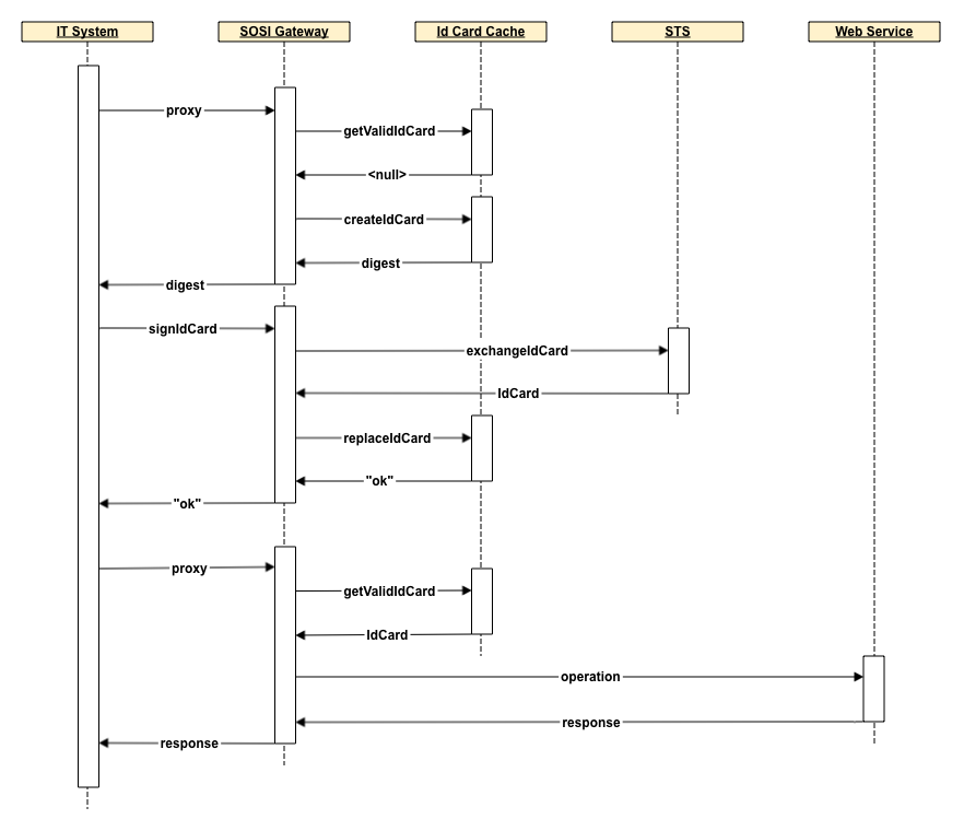 Dette sker ved at systemerne sender et usigneret id-kort med en identifikation af brugeren med i alle forespørgelser, SOSI Gateway erstatter dette id-kort med det passende fra cachen. Identifikationen af brugeren sker ved brug af dennes personnummer og betyder at ansvaret for at det korrekte id-kort bliver anvendt flyttes ud til slutsystemerne.