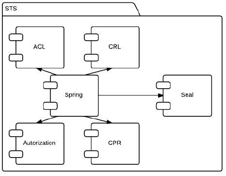STS består af en række del-komponenter (eller services), som konfigureres via Spring-frameworket. Komponenterne indkapsler følgende funktionalitet: